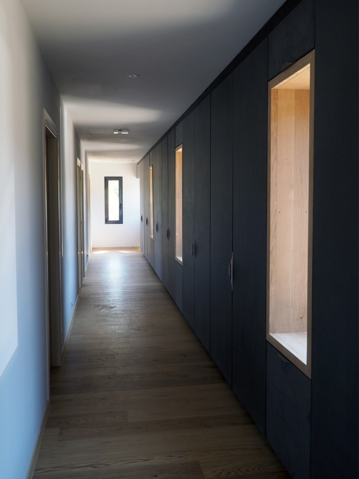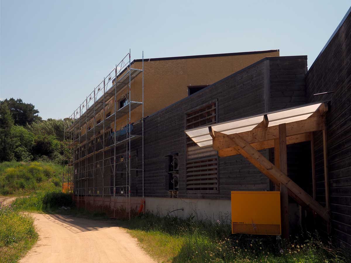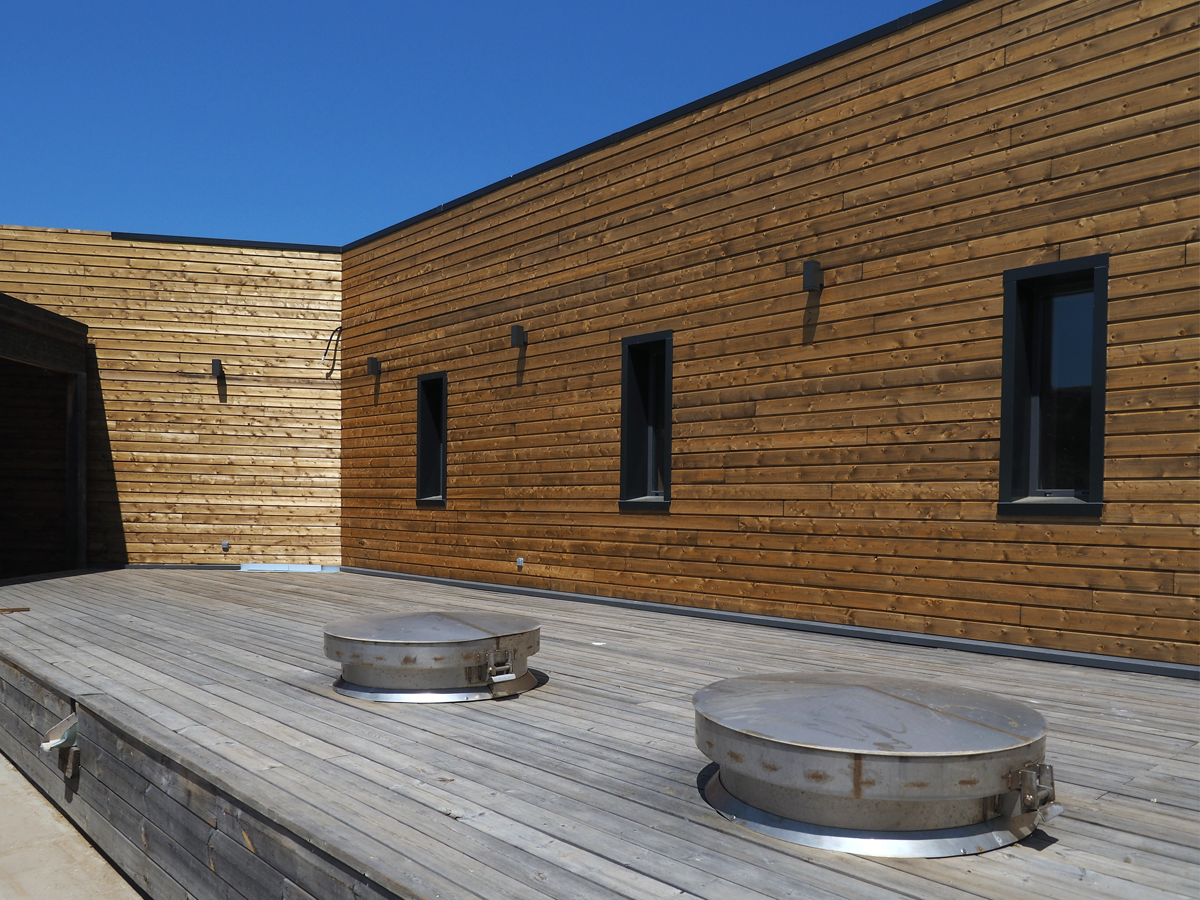 Matériaux : ossature bois, bardage bois, menuiseries aluminium, aménagements en médium teinté dans la masse, mobilier réalisé à partir des fûts de bois, toiture bacacier, parquet chêne.