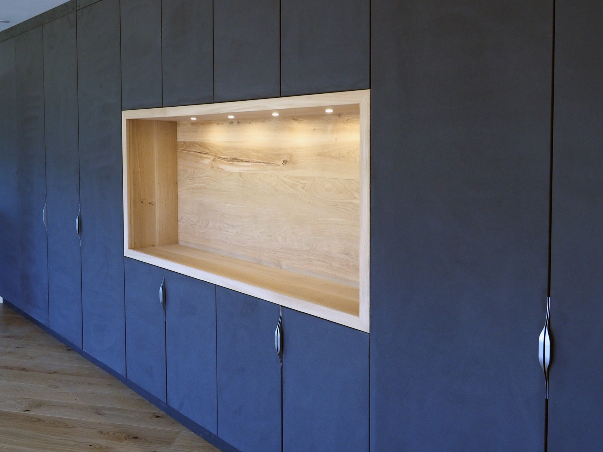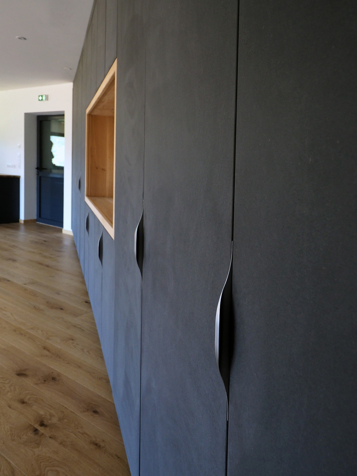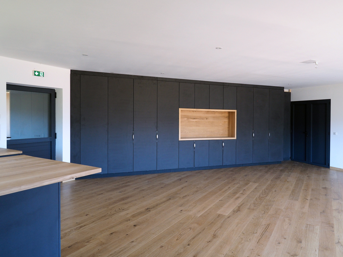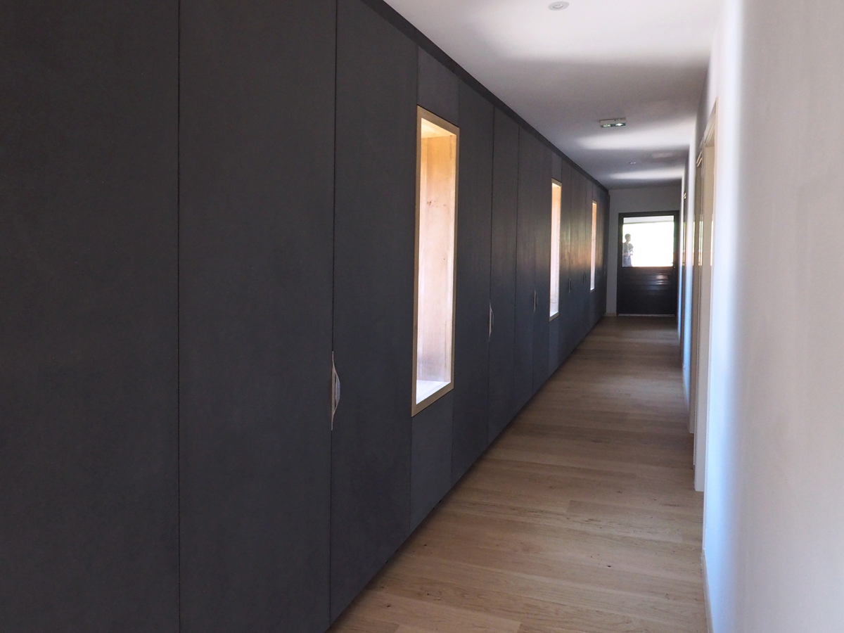 Matériaux : ossature bois, bardage bois, menuiseries aluminium, aménagements en médium teinté dans la masse, mobilier réalisé à partir des fûts de bois, toiture bacacier, parquet chêne.
