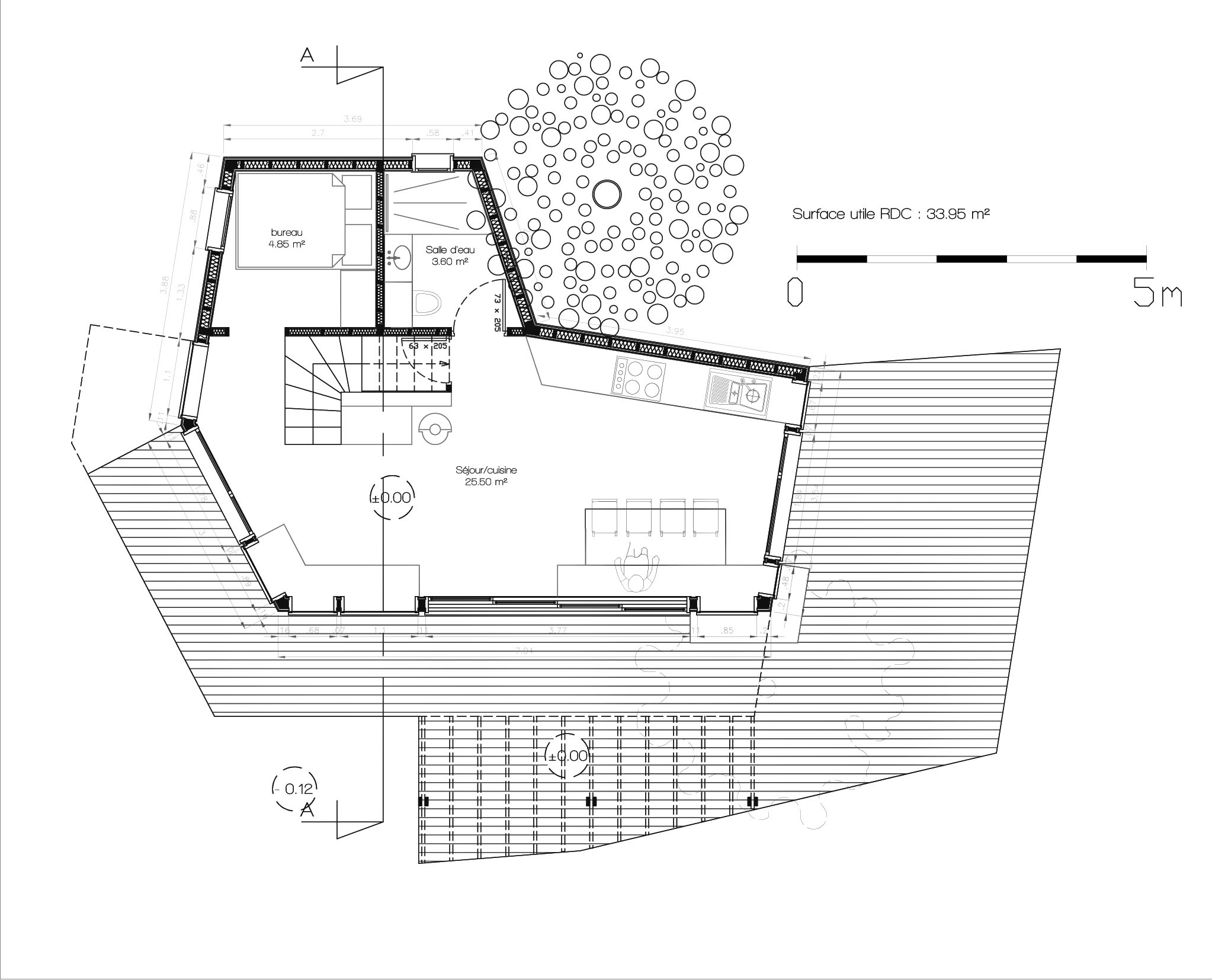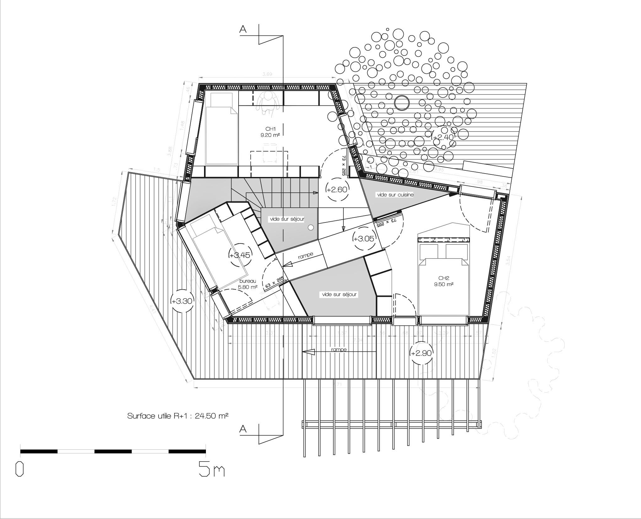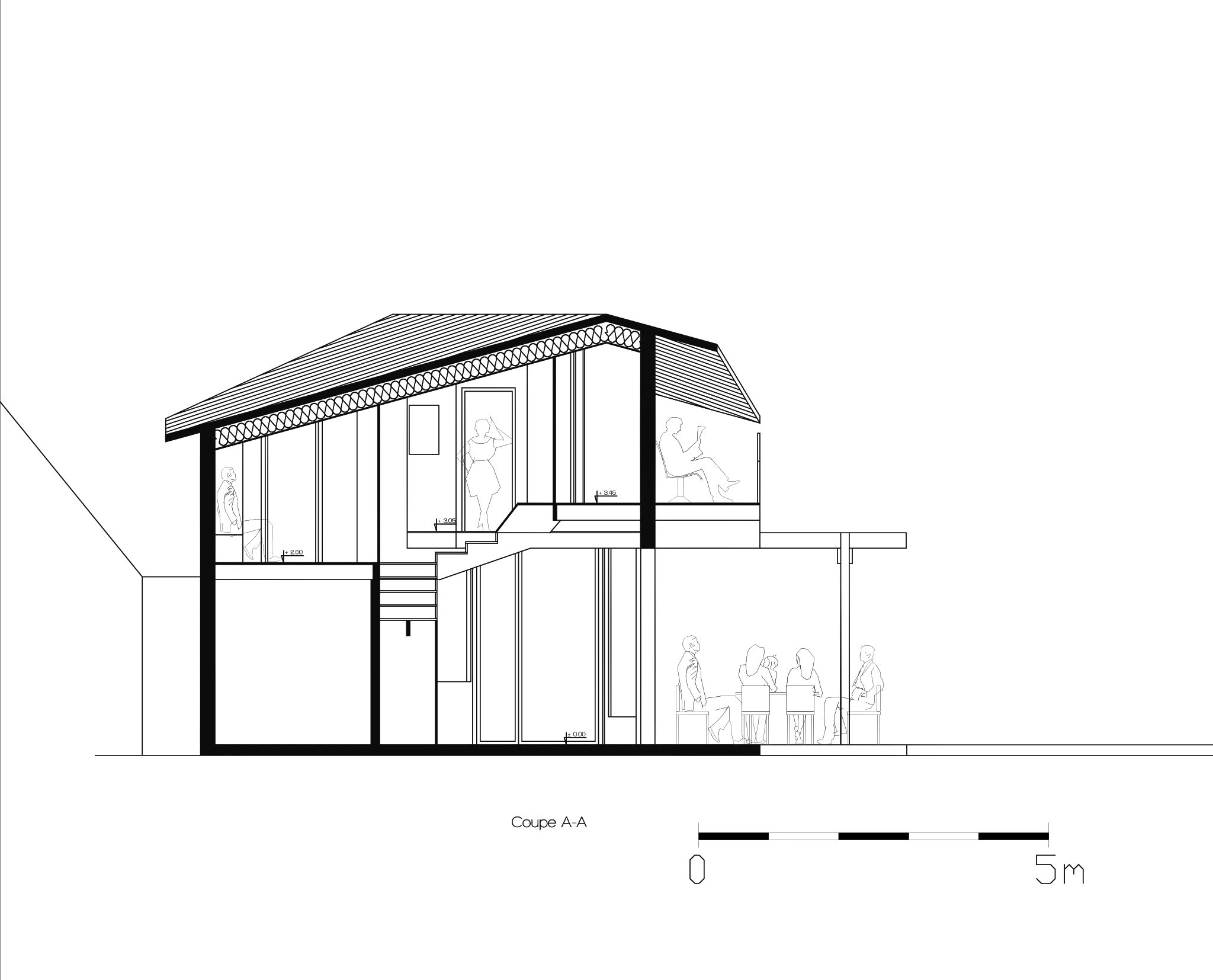 L’habitation aux proportions maîtrisées se lit donc comme un cabanon dans le paysage tandis que l’enveloppe extérieure suit le déroulé des espaces intérieurs. A l’intérieur, un grand volume sur double hauteur s’ouvre largement sur l’extérieur, sur le sud, et sur la vue. Au RDC, se trouvent les activités de jour et une salle d’eau tandis qu’à l’étage deux chambres et un bureau se déploient sous forme de mezzanines suspendues dans le volume général. Un jeu d’escaliers et de passerelles intérieurs créent donc le lien entre les différentes pièces. La construction est adossée au mur de soutènement existant. Ainsi, le séjour est en lien direct avec la planche basse, tandis que les deux chambres ont accès à l’extérieur par la planche supérieure.