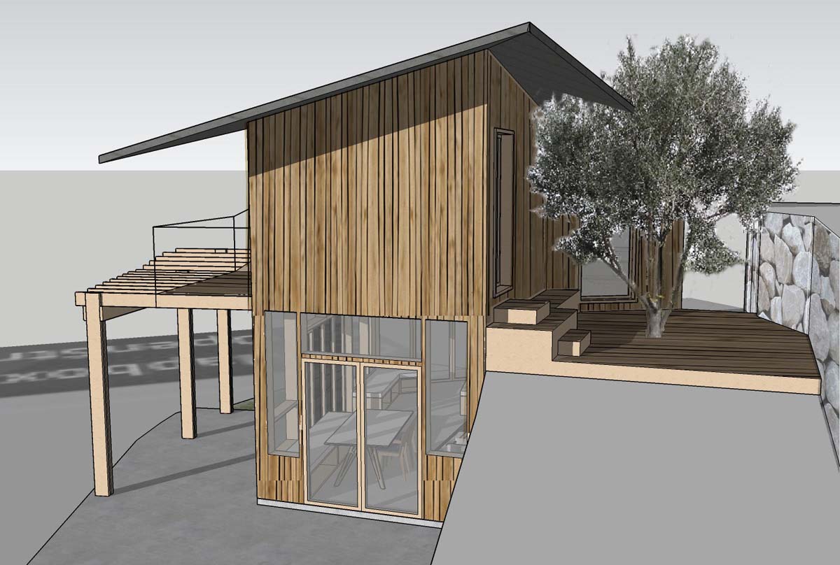 A l’extérieur, le bâtiment revêt une façade bois aux lames larges, afin de s’intégrer au mieux à l’environnement existant. La toiture est en bacacier en référence à l’architecture des bâtiments agricoles dont nous nous inspirons pour ce projet et en souvenir du cabanon existant. Les menuiseries seront elles aussi en bois. Elles s’ouvriront largement au RDC pour favoriser le lient entre l’intérieur et l’extérieur.