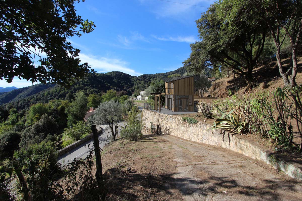 Le terrain clos de 1750 m2, en pente dans le sens Nord/Sud, est orienté vers le grand paysage. Un cabanon, symbole de l’histoire vivante des lieux, est existant sur une planche basse du terrain. Autour, hormis une esplanade de stationnement existante sur le même niveau, c’est une végétation de maquis qui est présente sur le terrain.