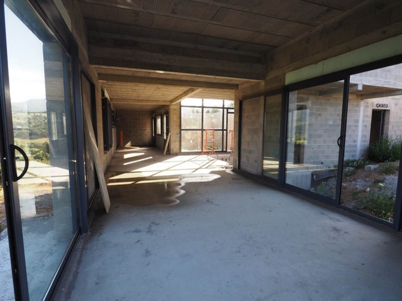 La maison s’organise donc autour de deux patios, un à l’est (entrée) sur lequel une large façade vitrée s’ouvre à l’endroit ou l’escalier permet d’accèder à l’étage. A l’ouest, les murs du patio enveloppent la piscine et les grandes terrasses. Cet aménagement extérieur se termine sur un pool house, composé de deux murs recouverts d’une dalle béton.