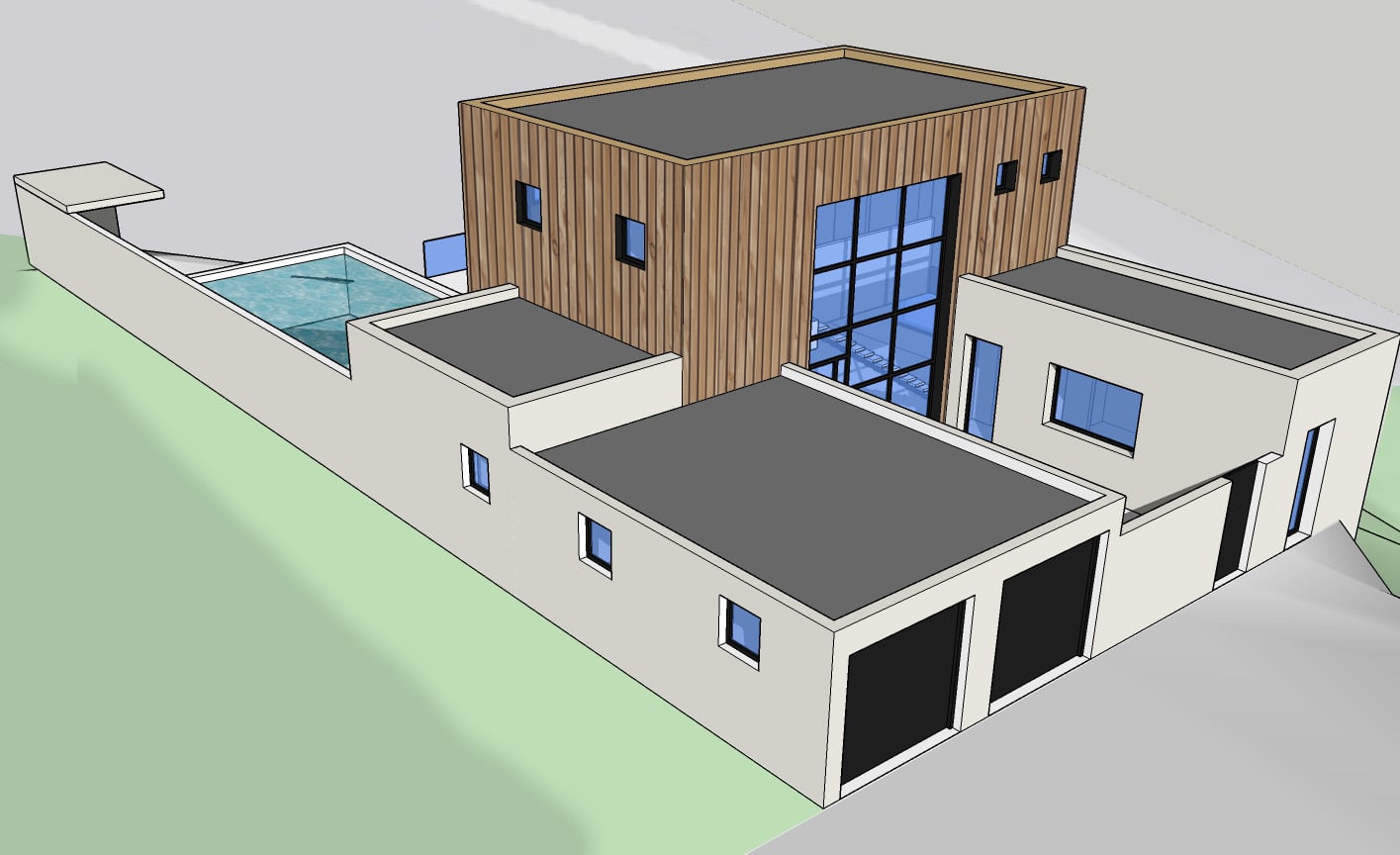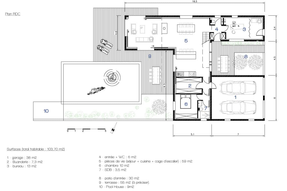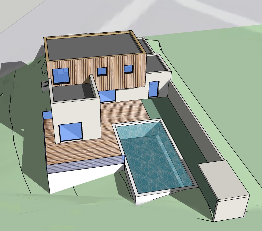 L’Architecture de la maison s’inspire des formes des constructions méditerranéennes, de même que son architecture réinterpréte de façon contemporaine la typologie des habitats à patio. Ainsi un mur au sud , faisant partie intégrante du parti architectural, protège des vis-à-vis tout en permettant l’ouverture des façades sud.