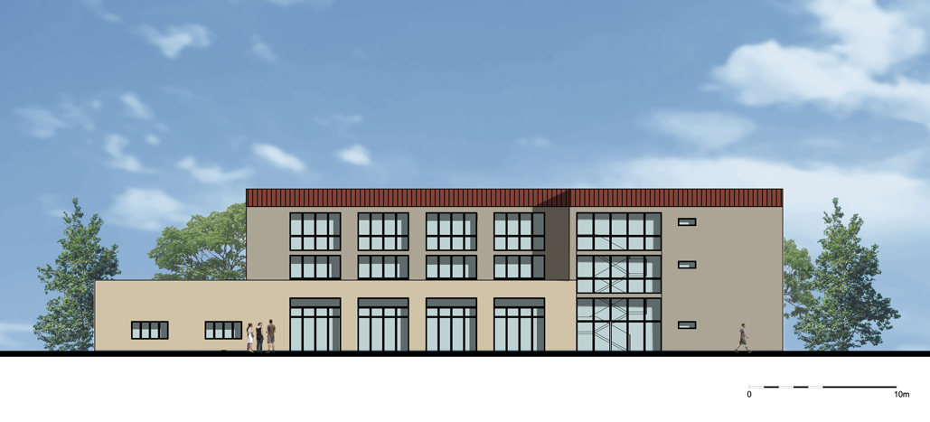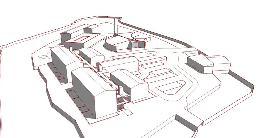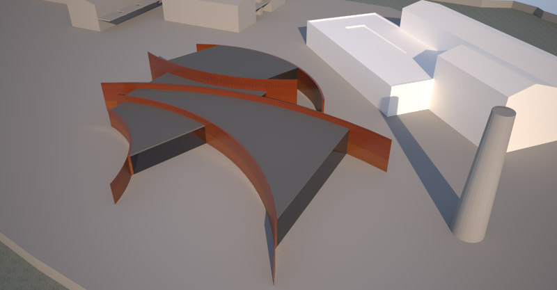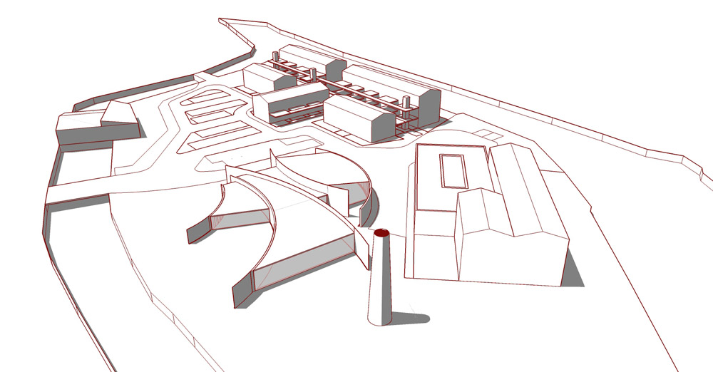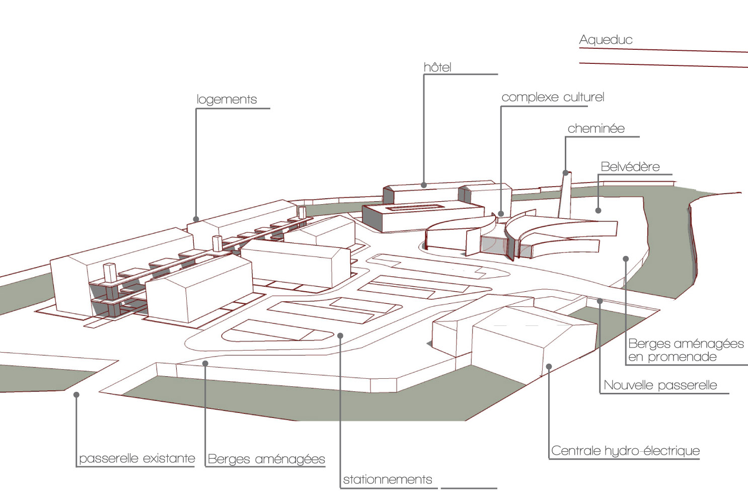 Nous conservons et restaurons les vestiges de l’activité de ce passé industriel encore présents sur le site (cheminée, centrale hydrolélectrique). De plus, nous proposons la construction d’un programme mixte : logements, structure hôtelière de standing, complexe culturel, promenade publique, stationnements. En mémoire du passé industriel, l’Architecture des bâtiments s’inspire des constructions anciennement présentes sur le site. De plus, ils s’implantent dans une même logique et densité qu’il y’a un siècle.
