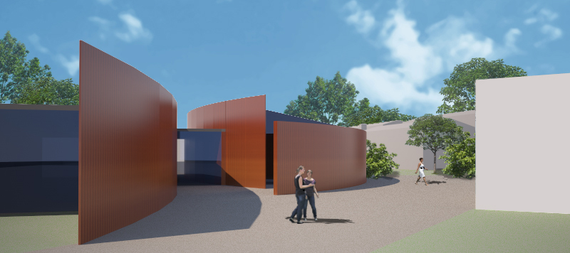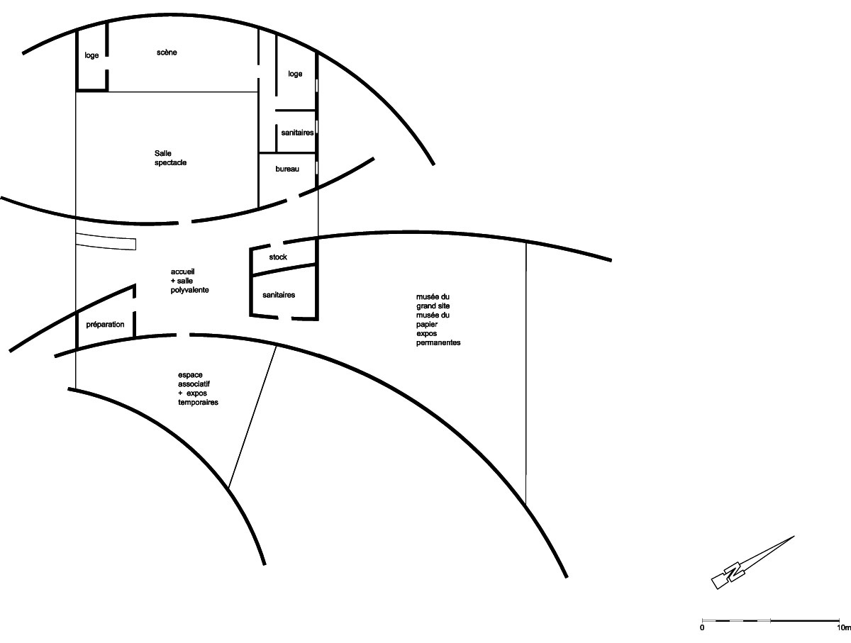 Malgré cette reconnaissance du passé, le site se tourne vers le 21 ème siècle. avec le complexe culturel qui s’érige en bâtiment signal. Son architecture naît du « mouvement de feuilles de papier », (car dans ce village la présence de l’eau a permis et permet encore la fabrication de papier à la main). Son programme est pluriel afin de répondre aux attentes de la population.