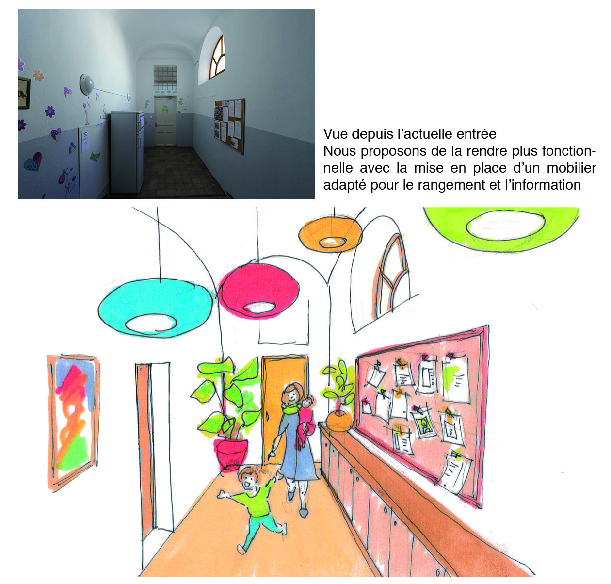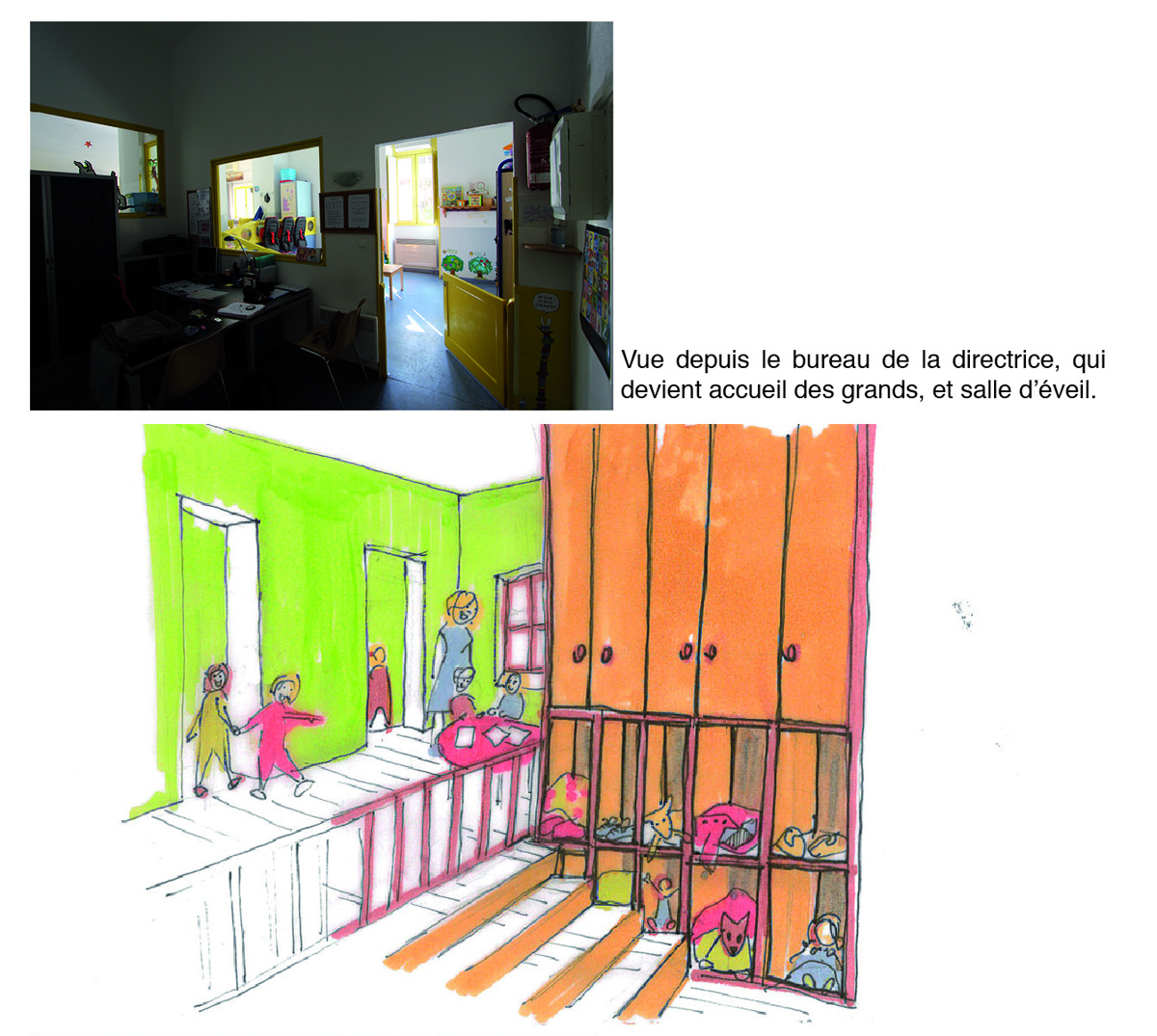 Enfin, depuis l’entrée on accède aux espaces du personnel et au bureau de la directrice. L’espace à +0.25, qui est aujourd’hui la salle du personnel devient la cuisine mise au normes pour permettre de cuisiner sur place. Aussi, des dispositifs d’amélioration de l’acoustique sont envisagés, de type suspensions lumineuses et colorées.