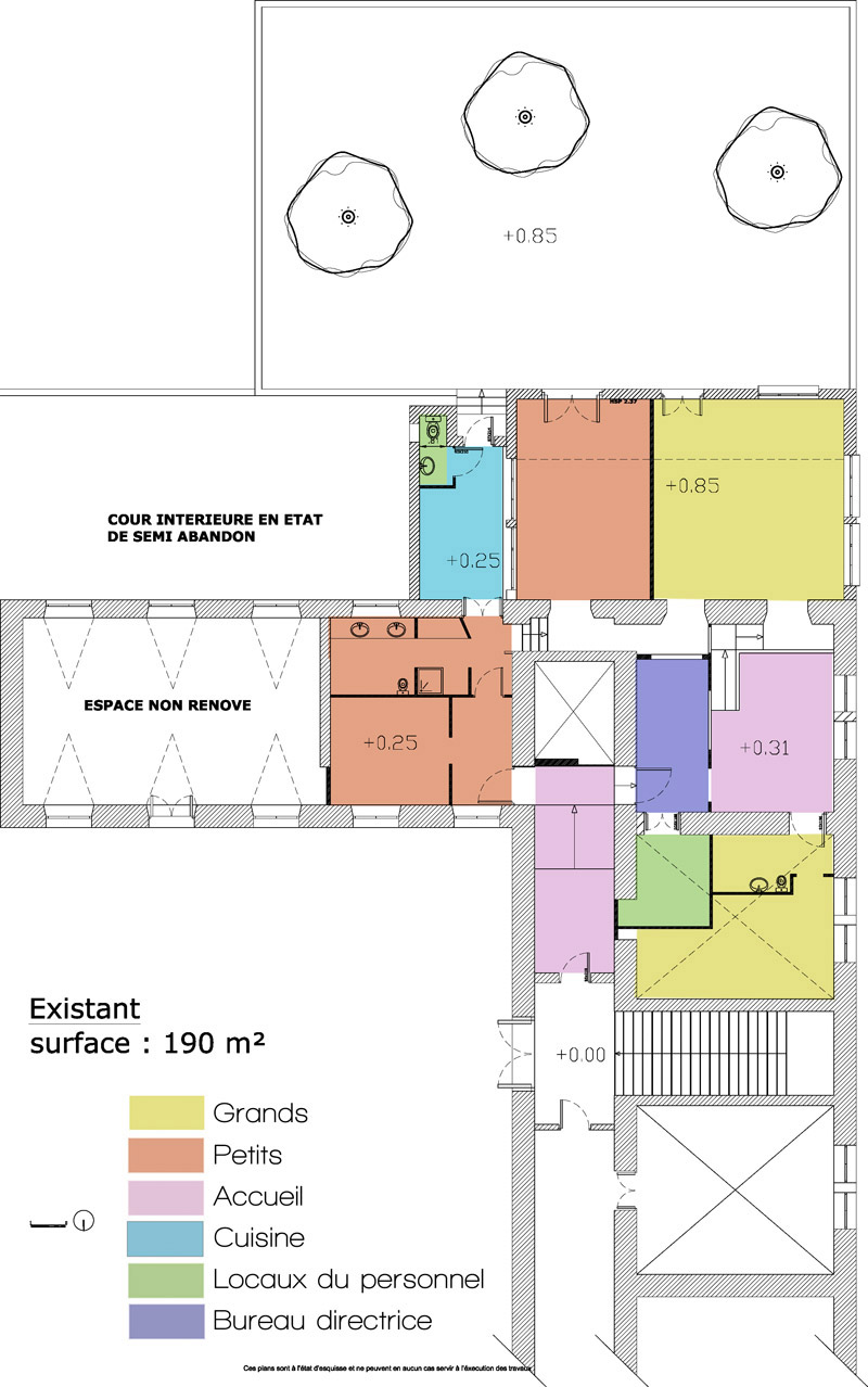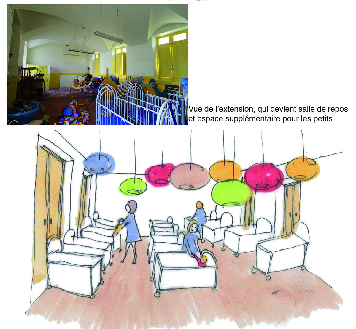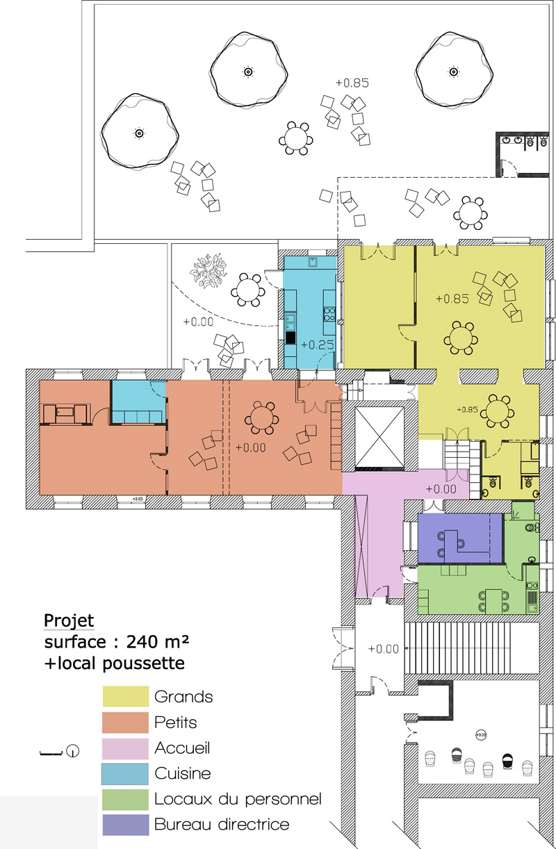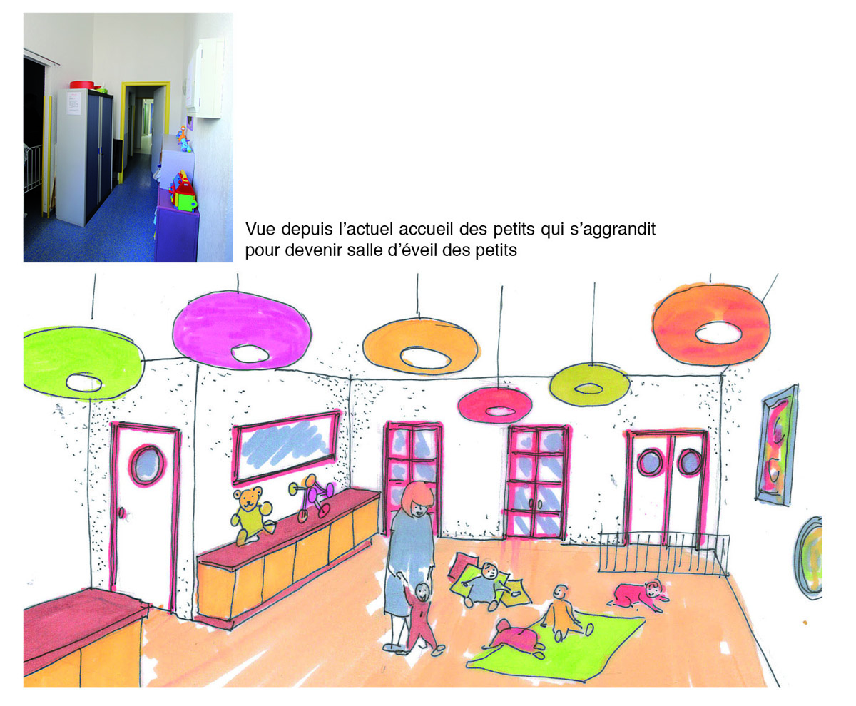 Les locaux sont donc entièrement repensés. Fruit d’extensions diverses, ils sont sur des niveaux différents (+0.00, +0.25, 0,31 0.85). Il est impossible de maintenir une rampe d’accès aux normes actuelles (environ 20 m de long sur 1.50 m de large soit une emprise de plus de 30 m²). Nous proposons donc la mise en place d’un escalier et un élévateur vertical pour passer du niveau +0.00 au niveau +0.85. La vie de la crèche s’organise autour du bien-être et du développement des enfants. Aussi, les volumes sont repensés pour leur donner un maximum d’espace. Les pièces des «grands» se trouvent sur le niveau haut (+0.85). Des pièces différenciées ont été imaginé pour l’éveil, tout en conservant une continuité visuelle.