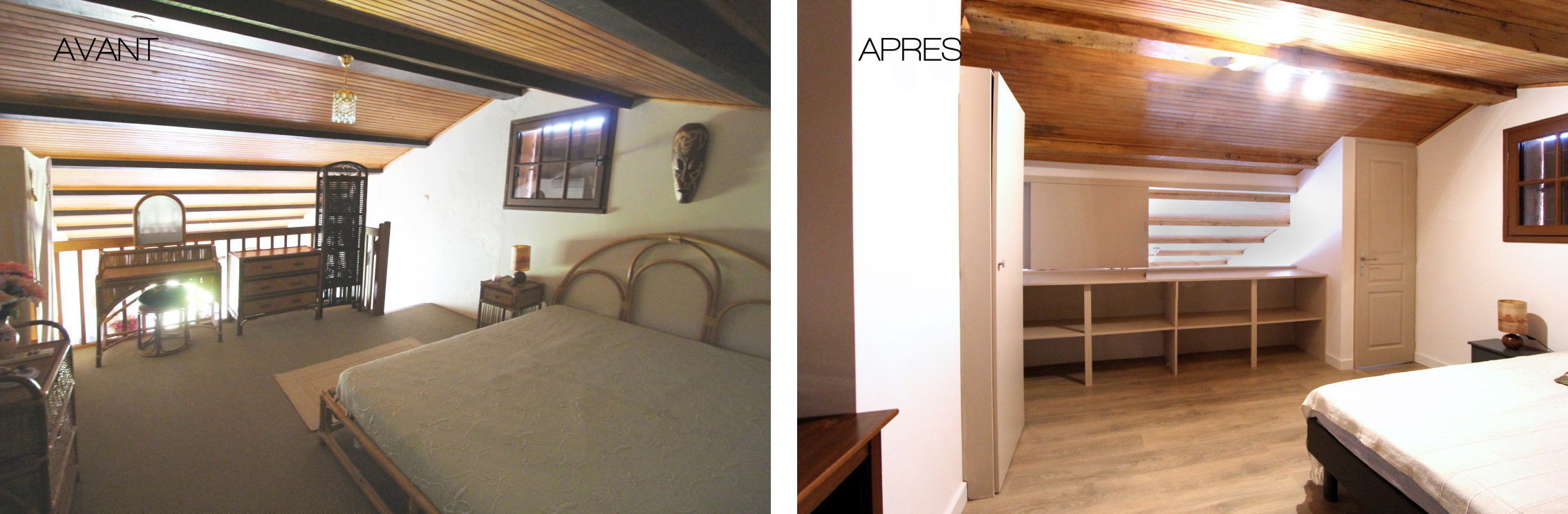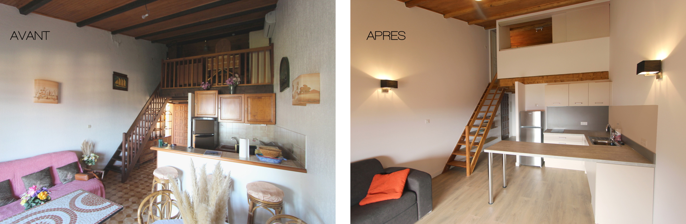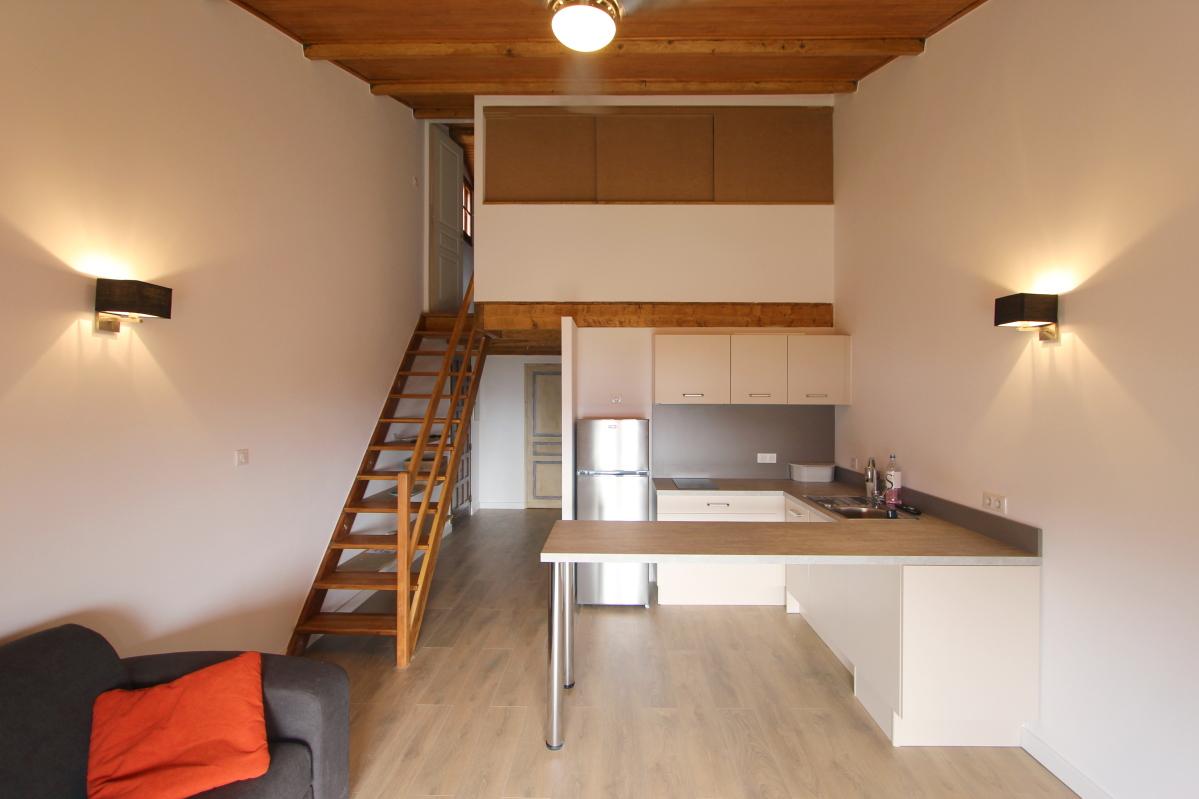 Nous repensons l’espace en le rendant plus ouvert et plus contemporain. La salle de bain est transformée, la cuisine devient un point essentiel. La mezzanine est fermée pour en faire une chambre indépendante. Le budget serré oriente les interventions vers des solutions pertinentes et économiques. Les ambiances sont douces et légères pour plaire à tous les habitants temporaires qui s’y succèdent. L’espace se veut lumineux et fluide, chaque changement bien que minimum devient essentiel. Les éléments de mobiliers sont également imaginés et réalisés.