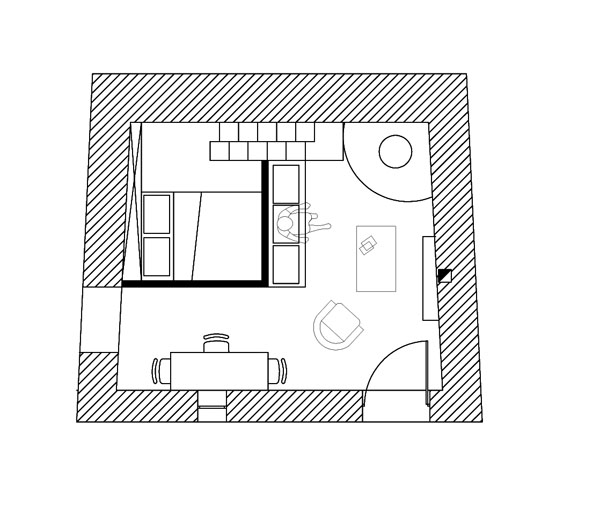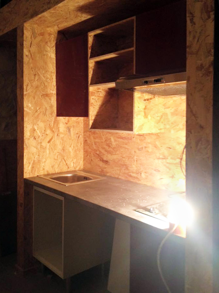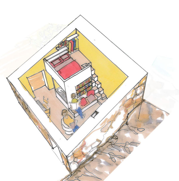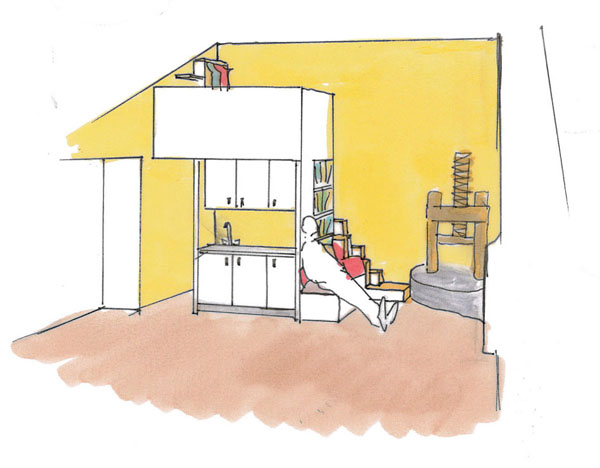 Nous créons une « boîte », en bois, qui abrite la salle de bains, un coin cuisine, et une bibliothèque. Sur le dessus de la « boîte » pose la chambre en mezzanine, dont l’accès se fait par des marches en « pas japonais » (cf références) pour éviter une trop grande perte de place.