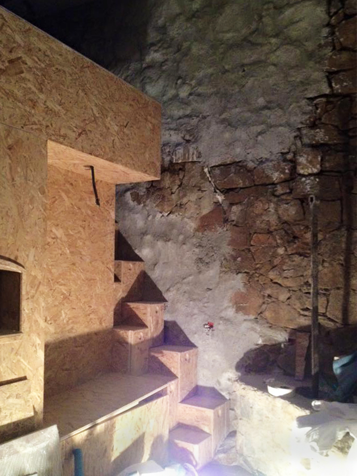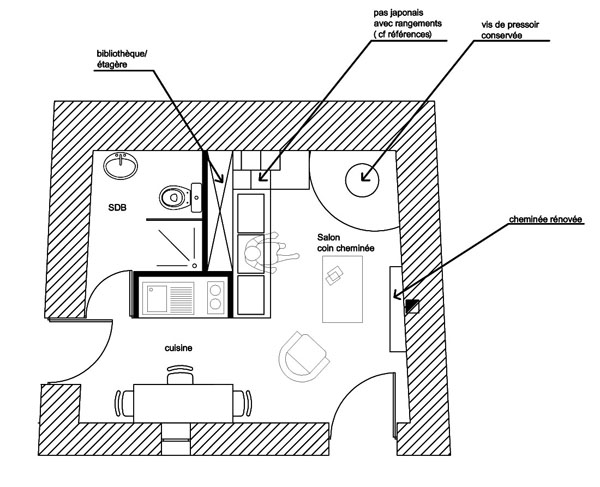 Autour de la vis de pressoir et de la cheminée existante et rénovée, l’espace s’organise en  salon.